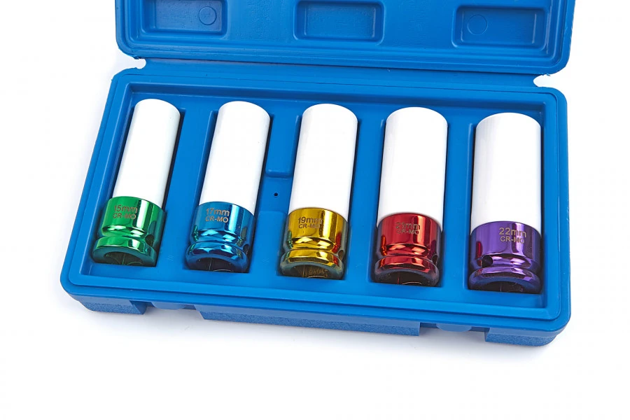 De krachtdoppenset bestaat in totaal uit vijf verschillende krachtdoppen en ieder model heeft een lengte van 90 mm. De maten bedragen 15 – 17 – 19 – 21 – 22 mm. De maat staat duidelijk aangegeven op iedere krachtdop, zodat je net even wat makkelijker aan de slag kunt gaan met het juiste model. De set leent zich erg goed voor het verwijderen van bouten op plaatsen waar geen beschadigingen mogen voorkomen. Ook verleng je de levensduur van de krachtdoppen aanzienlijk aangezien de zet wordt geleverd in mooi plastic opbergdoosje.