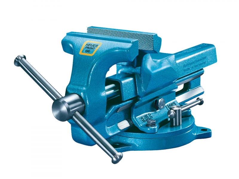 Met behulp van het HEUER draaiplateau kan de bankschroef, op gelijkblijvende hoogte, 360° worden gedraaid. Precies in de positie die u nodig heeft om het werkstuk te bewerken. Door het aandraaien van de kleine zwengel wordt het draaiplateau, en daarmee ook de bankschroef, op een veilige manier en precies in de gewenste positie vergrendeld.