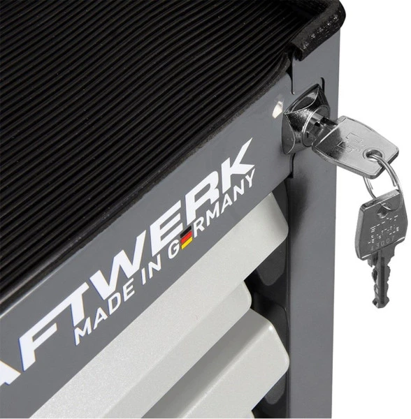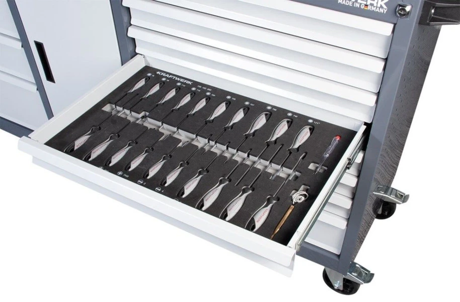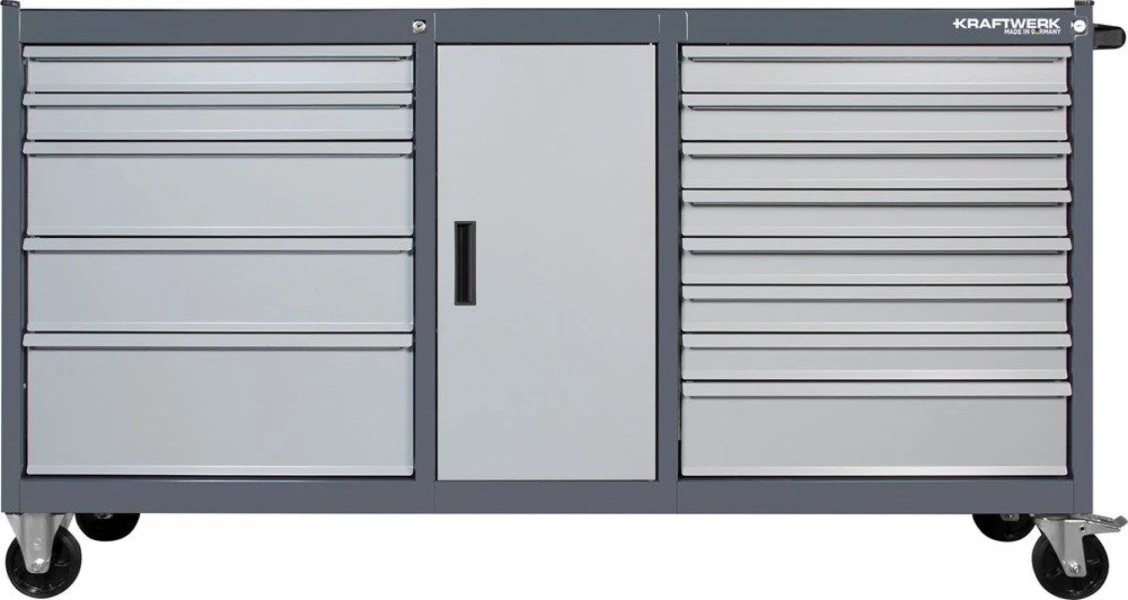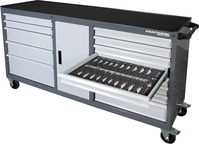 Een goede gereedschapswagen is onontbeerlijk voor klussers. Met deze Kraftwerk haal je een 180 centimeter brede wagen in huis die van alle gemakken en gereedschappen is voorzien. Zo kun je beide ladenblokken afzonderlijk afsluiten en is de wagen voorzien van valbescherming doordat maximaal één lade per keer geopend kan worden. Aan beide zijkanten kun je extra gereedschap kwijt aan de perfowanden. En zelf wordt de gereedschapswagen geleverd met diverse doppen, tangen en nog veel meer.